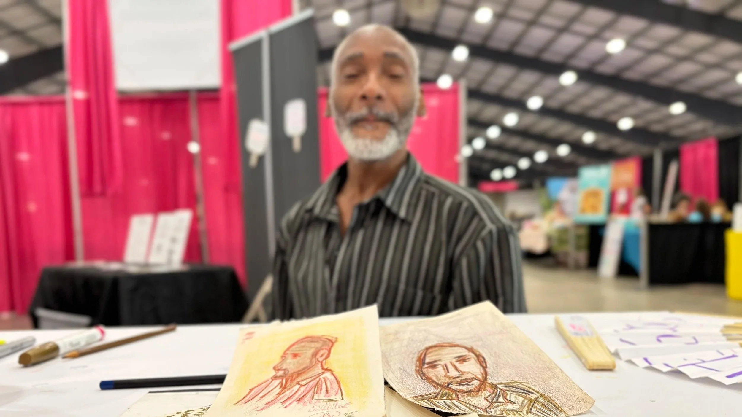 Daybreak Artist A.M. Hassan being paid to live paint “en plein air” at Mill Ridge Park’s 2025 Pear Jam.
