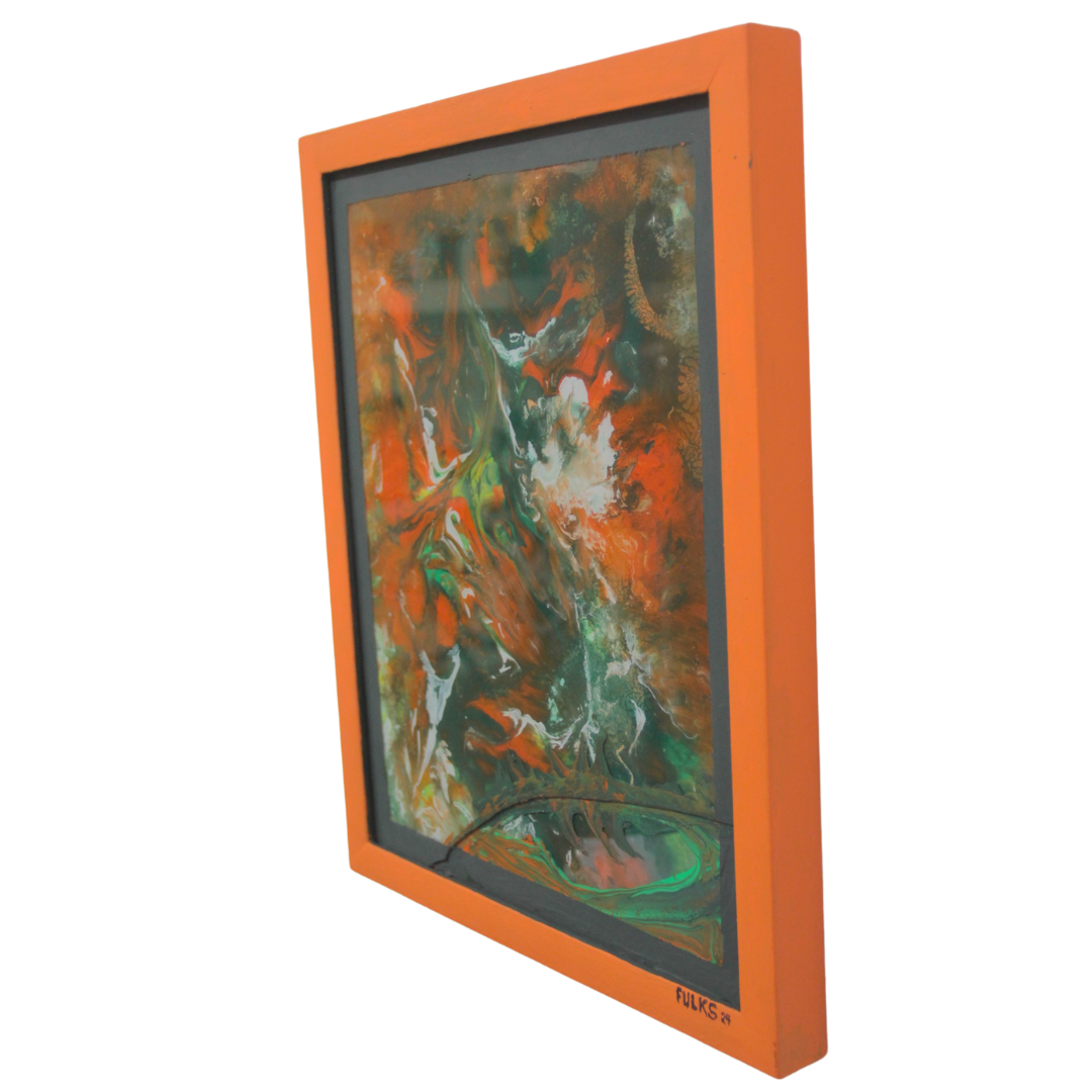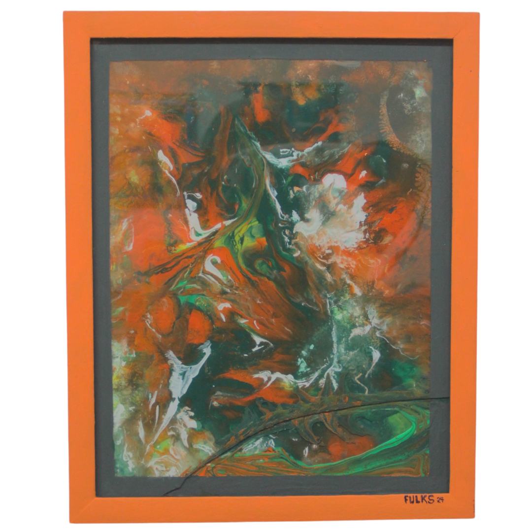With bold colors and a refreshing addition of dimension to the standard flat canvas, "Light My Fire" demonstrates the easy-going, natural rhythm by which Sam Fulks creates. Fulks refers to his technique as F.A.B. ART (Forget About Brushes), through which he moves paint with sharp tools and anything besides a standard paint brush. Fulks typically creates intuitively, without specific plans or drafts, and allows the paints to take a shape that is unknown until the piece is finished.