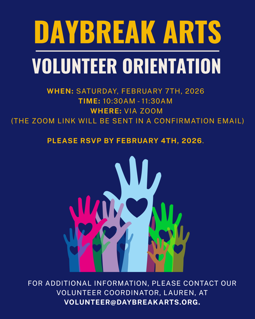 Complete this form to sign up. Email volunteer@daybreakarts.org with questions.
